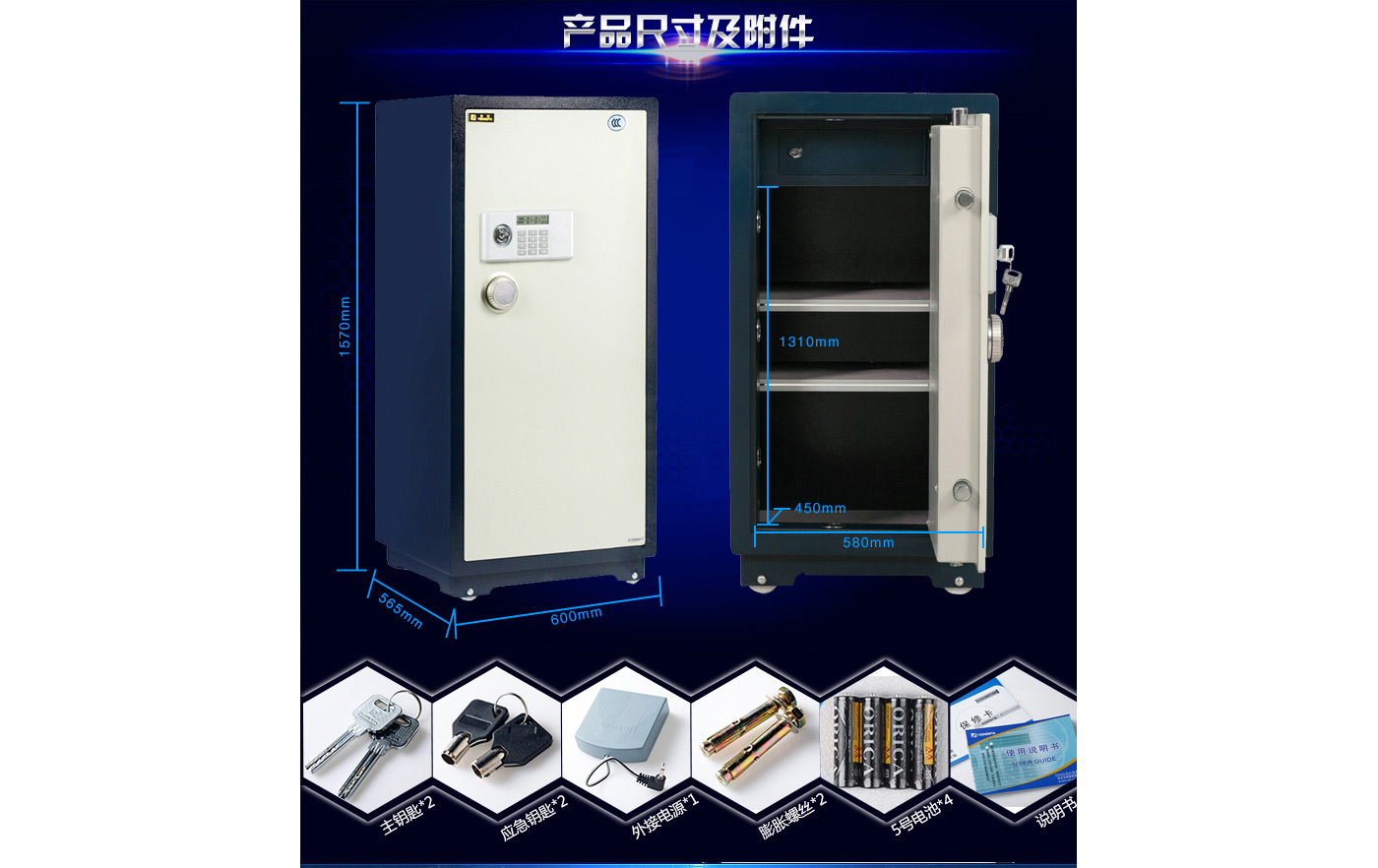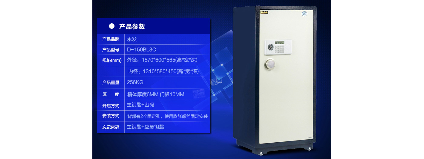永發經典電子系列3C認證保險箱D-150BL3C尺寸說明:1570高*600寬*565深mm(含底座) 重量:256kg